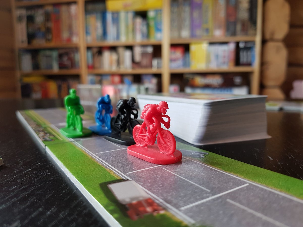 Flamme Rouge is a fast-paced, tactical bicycle racing game where each player controls a team of two riders: a Rouleur and a Sprinteur . The players’ goal is to be the first to cross the finish line with one of their riders. If more than one rider crosses the line in the same round, the one who gets furthest across wins. Players move their riders forward by drawing and playing numbered cards, which show how far each rider moves.
