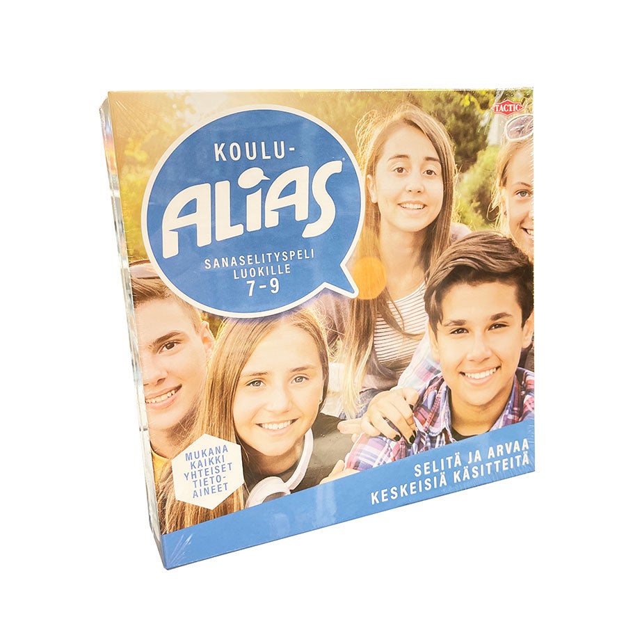 Opi pelaamalla! Yläkoululaisille suunniteltu TacTic Koulu Alias luokat 7-9 sopii pelattavaksi kotona tai koulussa. Oppilaat selittävät oppiaineiden keskeistä sanastoa vihjeiden, synonyymien ja vastakohtien avulla, toiset arvaavat. Alias on kielenkannat kirvoittava sanaselityspeli!