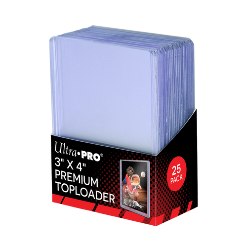 Protect and display your cards with Ultra PRO's 3" x 4" Ultra Clear Premium Toploaders made with 15 gauge thick PVC sheets. The PVC sheets used in these Premium Toploaders contain high-quality additives that both enhance the protection and clarity of the plastic. These Toploaders have overall dimensions of 3" x 4", are made to fit standard size (2.5" x 3.5") trading cards up to 35 pts in thickness, and keep them clean while preventing damage. Each pack contains 25 individual Toploaders.